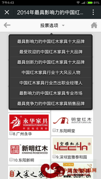 1、点击相关链接,进入红木总评榜微信投票界面。点击想要投票的奖项,进入投票界面。