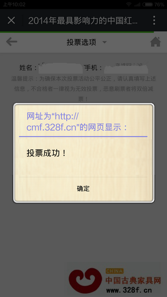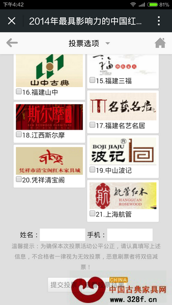 相较于网页版投票,微信投票通道更加简单快捷。各位投票者可关注品牌红木家具网(微信号:www328f)与品牌红木家具微新闻(微信号:www-328f-cn)公众微信号,随时随地进行投票。而且只需点击微信相关链接,进入页面,就能进入投票界面。届时,可以选择想要投票的奖项与品牌,最后填写姓名以及联系方式,即可轻松完成整个投票过程。具体操作教程如下: