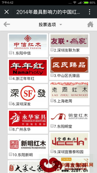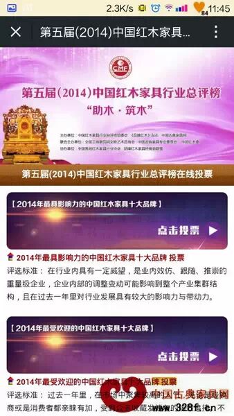 [摘要]第五届(2014)中国红木家具行业总评榜微信通道开放!各位投票者可关注品牌红木家具网(微信号:www328f)与品牌红木家具微新闻(微信号:www-328f-cn)公众微信号,随时随地进行投票。