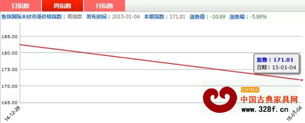 2015年伊始,红木市场依旧成沉寂在震荡调整的态势中。2014年12月29日—2015年1月4日,红木分类指数总体呈下跌趋势,周指数收于171.81点,成交额较前周下跌了10.69点,跌幅为5.86%。在代表材方面,仅交趾黄檀和刺猬紫檀价格略有上涨,涨幅分别为0.24%和0.41%。