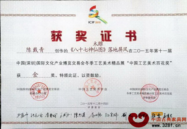 [摘要]12月14日,为期4天的第十一届中国(深圳)国际文化产业博览交易会冬季工艺美术精品展(以下简称冬季文博会)在深圳会展中心圆满闭幕,同期还揭晓了中国工艺美术百花奖评选结果并举行颁奖典礼。本次奖项由文博会组委会办公室和中国工艺美术学会主办,深圳报业集团、文博会公司和深圳市工艺美术行业协会承办,共有581件作品参评。中山市鸿庭轩古典家具有限公司(以下简称鸿庭轩)董事长、工艺美术大师陈戴青的木雕作品《八十七神仙木雕图》和《木雕<花开富贵>落地屏风》经初审和终审,最终分别荣获中国工艺美术百花奖金奖和铜奖的荣誉。