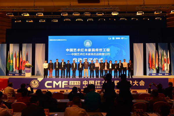 全国政协第十一届副秘书长、全国工商联第十届副主席宋北杉(左八),全国工商联民间文物艺术品商会名誉会长、原国家文物局副局长张柏(左七),中山市政协主席丘树宏(右九),中山市大涌镇党委书记黄红全(右七),全国工商联民间艺术品商会秘书长肖秉侠(左六),全联艺术红木家具专委会执行会长林伟华(左五)以及全联艺术红木家具专委会首届主席团成员中山区氏臻品董事长区胜春(左二)、深圳泰和园董事长邵湘文(左四)、东阳卓木王红木董事长杜承三(右六)、东阳新明红木董事长张新民(左三)、东阳中信红木董事长李忠信(右三)、中山东成红木董事长张锡复(右四)、中山波记家具董事长伍建波(左一)、东莞戴为红木总裁戴爱国(右五)、上海老周红木董事长周仲坚(右一)、西安红木雅居阁总裁石立峰(右二)共同见证中国艺术红木家具名品联盟公约的启动