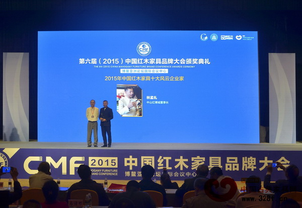 红博城荣获“2015年中国红木家具特别影响力专业市场”荣誉称号,红博城副总经理林志洪(左四)上台领奖