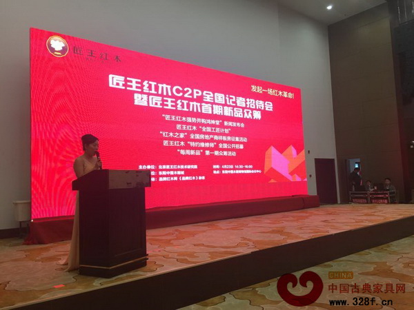 一场是在早上的“2016东阳红木家具品牌新品发布会暨招商发布会”上,匠王红木举行的“匠王红木C2P商业模式全国研讨会”,通过短短的不到十分钟的阐述,让在座的经销商、媒体认识这种新模式。