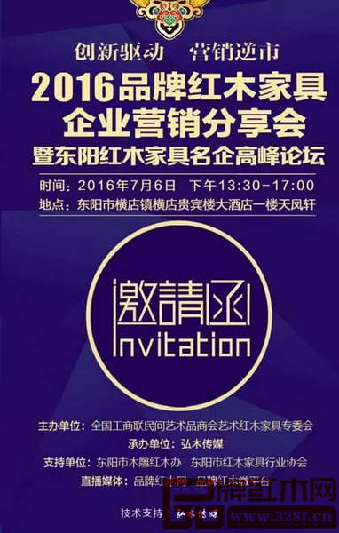 为了给红木家具企业解答疑惑,帮助企业强化品牌战略,实现企业产品市场大营销,7月6日下午,由全联艺术红木家具专委会主办,弘木传媒承办的2016品牌红木家具企业营销分享会暨东阳红木家具名企高峰论坛,将于横店贵宾楼拉开帷幕。
