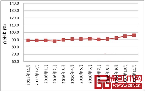 2016年11月份全国红木制品市场景气指数(HPMI)为96.0,环比上升一个百分点(见图1)。
