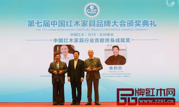 明清居董事长金彪云(左一)荣获“中国红木家具行业贡献终身成就奖”