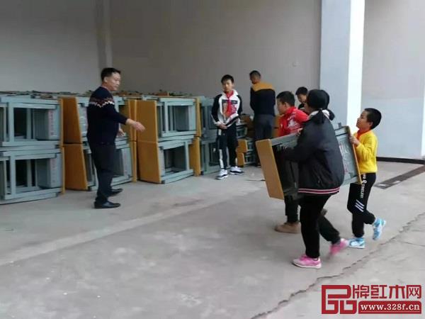 捐赠现场,同学们看到崭新的课桌椅都非常的开心,并自己主动做起了“小搬运工”,将课桌椅搬回教室摆放整齐。