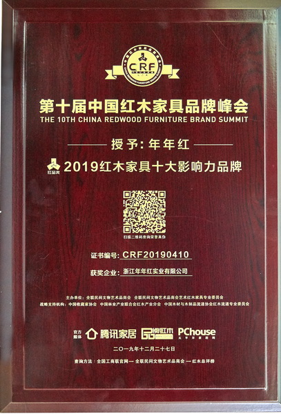 年年红凭借强大的实力蝉联“红木家具十大影响力品牌”