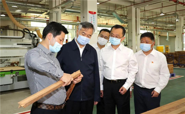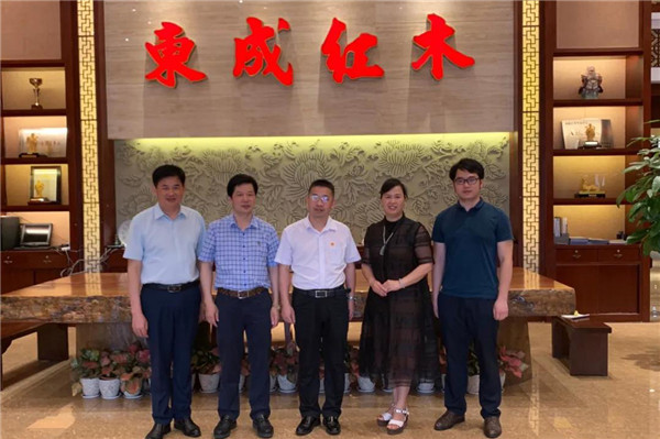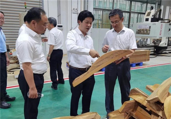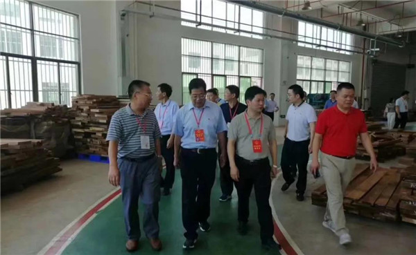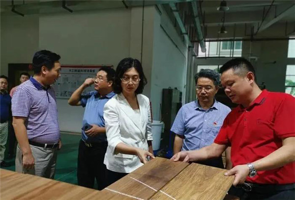 8、7月2日,广东省林业局改革和产业发展处林东红处长、广东省林业局林炎勇处长、广东省林业调查规划院林寿明院长一行在五华县林业局温定基局长的陪同下,到东成红木五华生产基地实地考察。调研组对智能化工厂给予了充分的肯定,高度评价了东成红木关于实现智能环保制造、引领行业转型升级等方面的成绩。