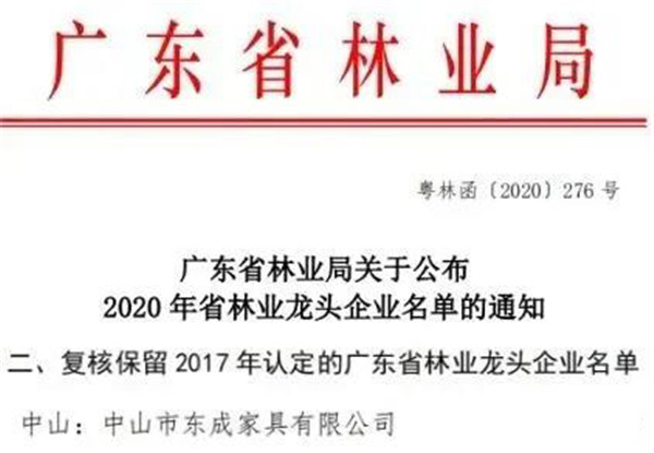 2、10月,《广东省林业厅关于公布2020年省林业龙头企业名单的通知》正式公布,中山市东成家具有限公司以技术、人才和市场优势,发挥示范带头作用,为广东省林业发展做出贡献,顺利通过复核,再次被认定为“广东省林业龙头企业”。
