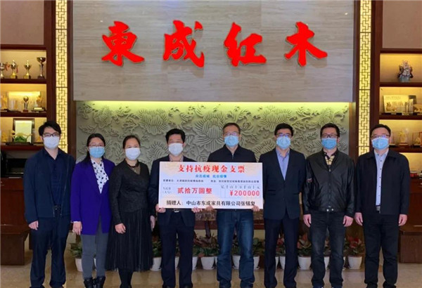 1、2月24日,在全国抗击新冠肺炎疫情取得阶段性成就的关键时期,东成红木复工复产后,向中山市大涌镇防控疫情指挥部捐款人民币20万元整,用于大涌镇防控疫情工作。加上此次的捐款,东成红木董事长张锡复先生与其夫人、其经营企业,已累计为抗疫捐款46万元。