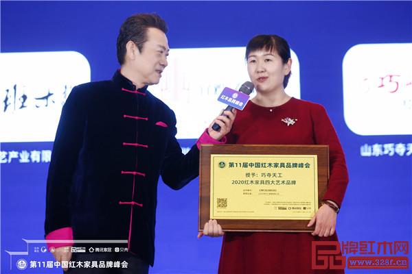 巧夺天工红木首获“2020红木家具四大艺术品牌”,营销总经理陈树娟(右二)上台领奖