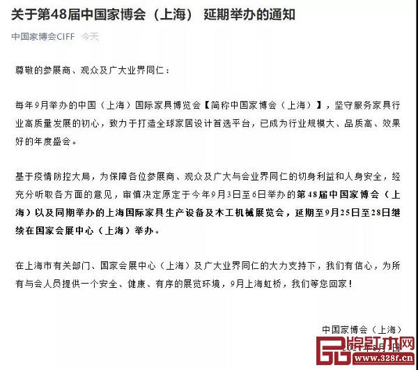 因为新一轮疫情影响,原定于2021年9月3-6日在上海虹桥国家会展中心举办的第48届CIFF中国国际家具博览会(上海)将延期至2021年9月25-28日举行!