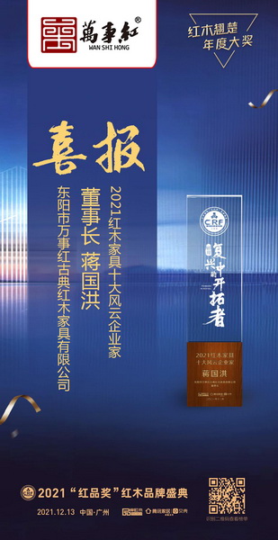 万事红董事长蒋国洪荣获“2021红木家具十大风云企业家”
