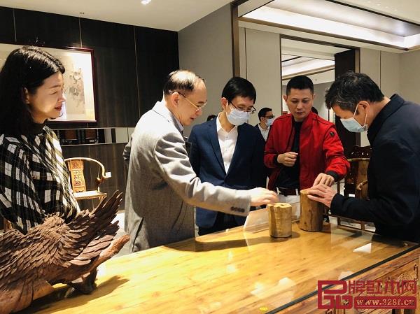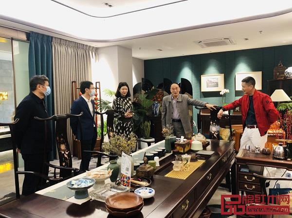 中国家具协会副理事长、红古轩品牌创始人吴赤宇(左)为中山市政协副主席刘志伟(右)介绍红古轩生产经营情况