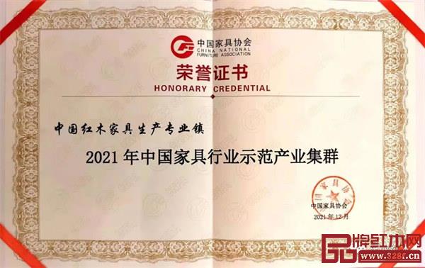 大会上,中国家具协会对一批表现突出的优秀单位进行了表彰,中国红木家具生产专业镇——大涌,荣获“2021中国家具行业示范产业集群”称号。