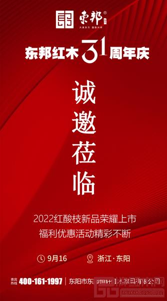 2022年,东邦红木迎来了三十一周岁的生日。金秋九月,东邦红木隆重推出2022红酸枝新品,全新的设计、热门的材质,东邦红木三十一周年感恩大回馈,即将火热开始,诚邀莅临。