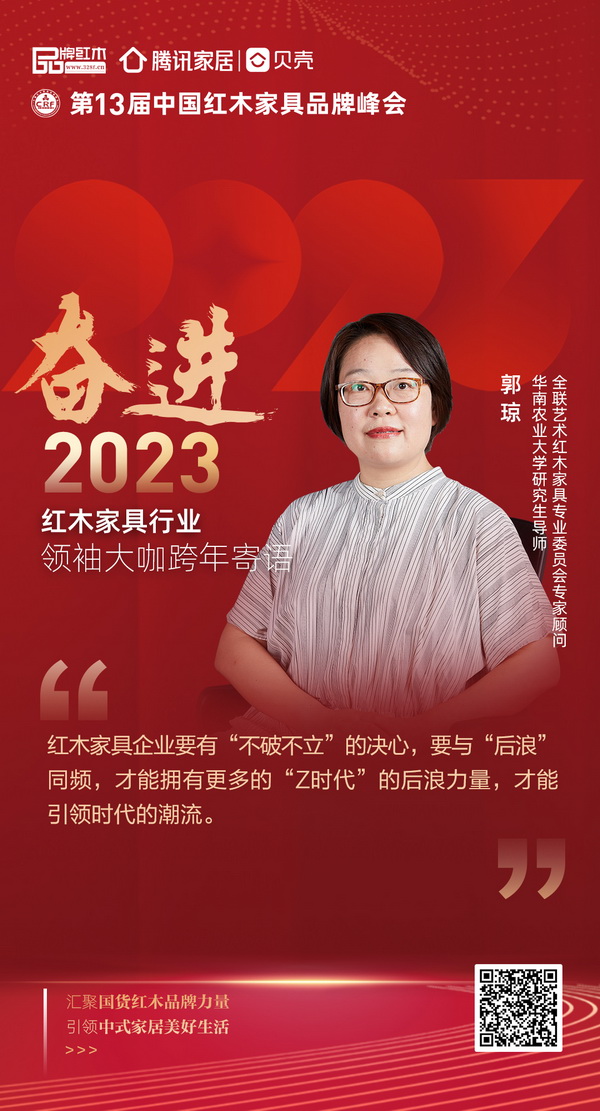 全联艺术红木家具专业委员会专家顾问、华南农业大学研究生导师郭琼为红木家具行业奋进2023年送来寄语:红木家具企业要有“不破不立”的决心,要与“后浪”同频,才能拥有更多的“Z时代”的后浪力量,才能引领时代的潮流。