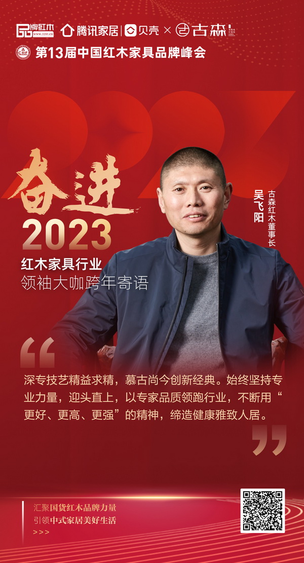 [摘要]古森红木董事长吴飞阳为红木家具行业奋进2023年送来寄语:深专技艺精益求精,慕古尚今创新经典。始终坚持专业力量,迎头直上,以专家品质领跑行业,不断用“更好、更高、更强”的精神,缔造健康雅致人居。