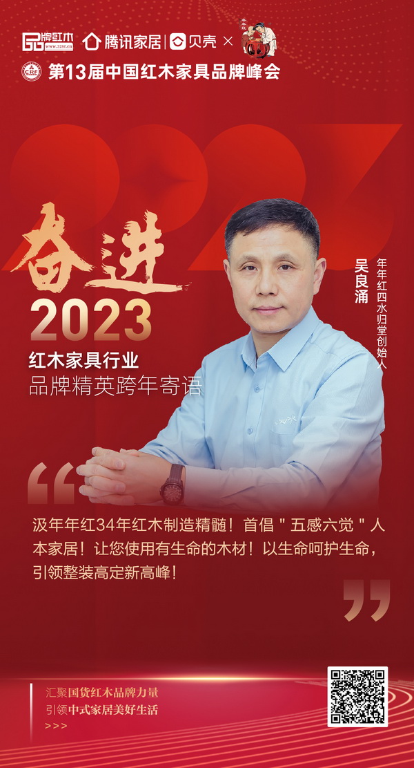 年年红四水归堂创始人吴良涌为红木家具行业奋进2023年送来寄语:汲年年红34年红木制造精髄!首倡"五感六觉"人本家居!让您使用有生命的木材!以生命呵护生命,引领整装高定新高峰!