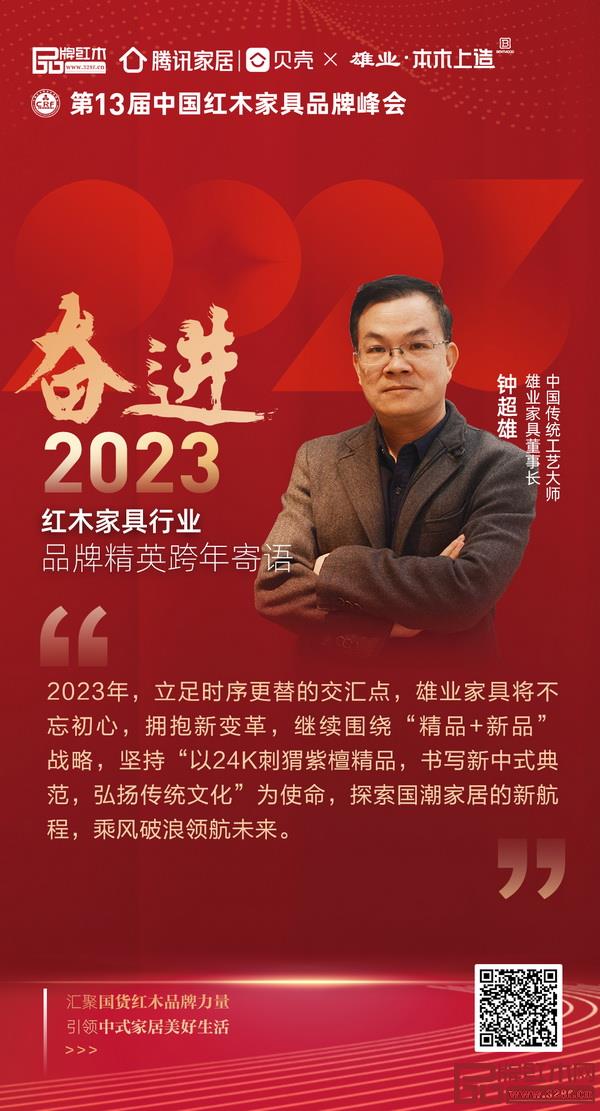 中国传统工艺大师、雄业家具董事长钟超雄为红木家具行业奋进2023年送来寄语:2023年,立足时序更替的交汇点,雄业家具将不忘初心,拥抱新变革,继续围绕“精品+新品”战略,坚持“以24K刺猬紫檀精品,书写新中式典范,弘扬传统文化”为使命,探索国潮家居的新航程,乘风破浪领航未来。