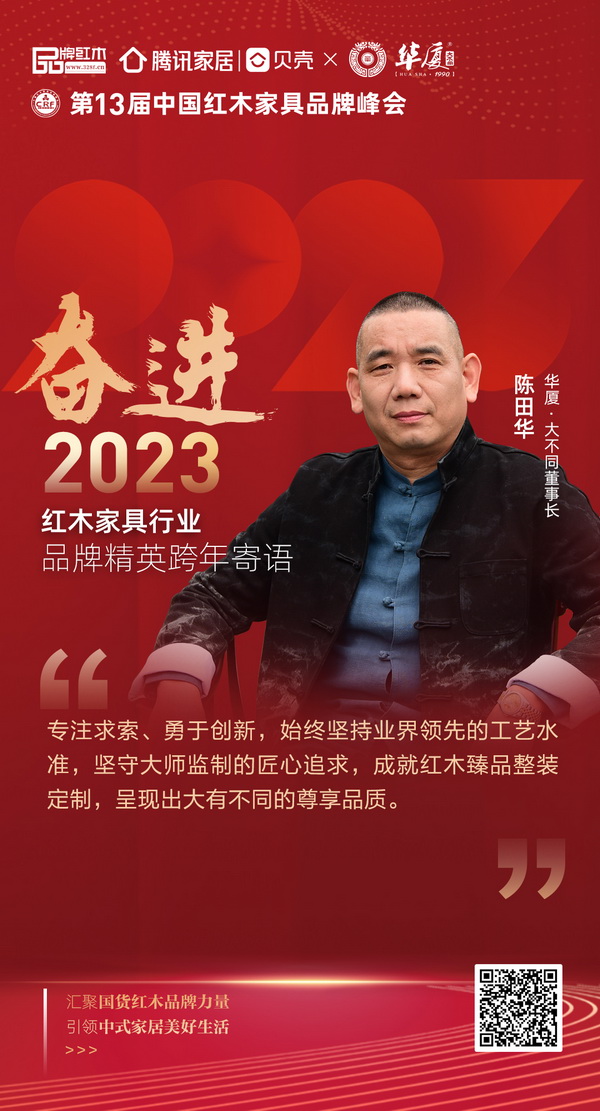 华厦·大不同董事长陈田华为红木家具行业奋进2023年送来寄语:专注求索、勇于创新,始终坚持业界领先的工艺水准,坚守大师监制的匠心追求,成就红木臻品整装定制,呈现出大有不同的尊享品质。