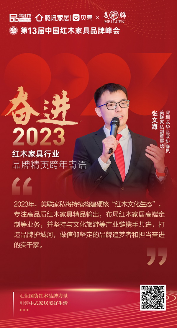 深圳龙华区政协委员、美联家私副董事长张文海为红木家具行业奋进2023年送来寄语:2023年,美联家私将持续构建硬核“红木文化生态”,专注高品质红木家具精品输出,布局红木家居高端定制等业务,并坚持与文化旅游等产业链携手共进,打造品牌护城河,做信仰坚定的品牌追梦者和担当奋进的实干家。