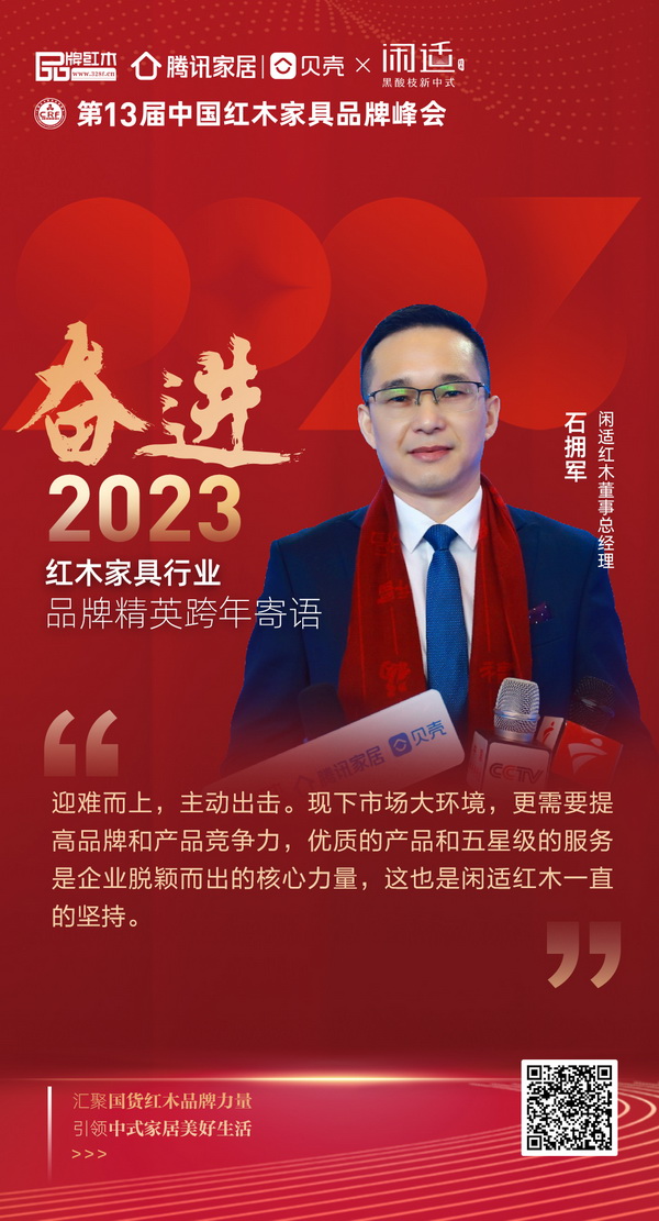 闲适红木董事总经理石拥军为红木家具行业奋进2023年送来寄语:迎难而上,主动出击。现下市场大环境,更需要提高品牌和产品竞争力,优质的产品和五星级的服务是企业脱颖而出的核心力量,这也是闲适红木一直的坚持。