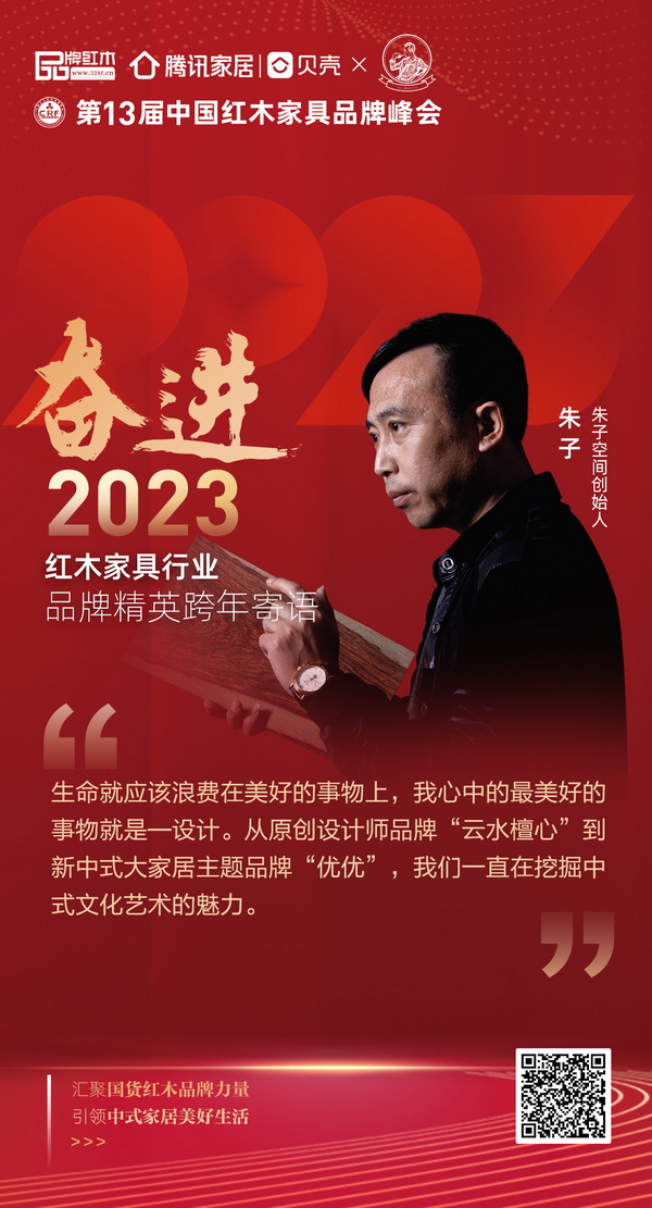 [摘要]朱子空间创始人朱子为红木家具行业奋进2023年送来寄语:生命就应该浪费在美好的事物上,我心中的最美好的事物就是—设计。从原创设计师品牌“云水檀心”到新中式大家居主题品牌“优优”,我们一直在挖掘中式文化艺术的魅力。