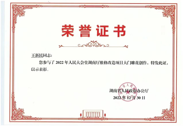 [摘要]红古轩工艺大师王新民参与人民大会堂项目改造,并荣获湖南省人民政府颁发的证书。