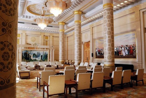 人民大会堂湖南厅是人民大会堂的一个具湖南特色的大厅。湖南厅总面积495平方米,装修风格庄重典雅,雄伟高大,具有殿堂气派。厅内北面正中墙镶嵌宽8.2米,高3.5米的巨幅绒绣画《毛主席与各族人民在一起》。南面陈设着素瓷雕塑工艺品《毛泽东故居》。东侧有双面绣屏《荷塘野鸭》,展示洞庭湖的美丽和出水芙蓉的高洁。南侧大屏风上为湘绣《屏开花艳舞东风》。