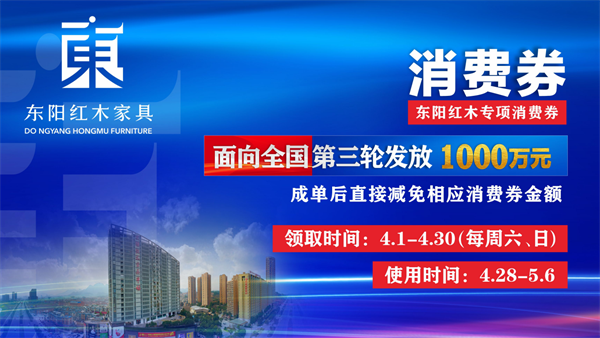 为激活红木家具消费市场,提振顾客消费信心,助力红木产业复兴,东阳红木家具市场(东阳世贸大道599号)面向全国消费者发放价值1000万元的第三轮红木家具消费券。