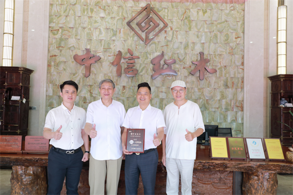全联艺术红木家具专业委员会专家顾问、故宫博物院文保科技部原主任曹静楼(左二),全联艺术红木家具专业委员会专家顾问、清华大学家具设计高研班讲座教授彭亮(右一),全联艺术红木家具专业委员会执行会长、品牌红木创始人、CEO林伟华(左一)走进中信红木,浙江省工艺美术大师、中信红木董事长李忠信(右二)接受《大国精品》栏目颁牌