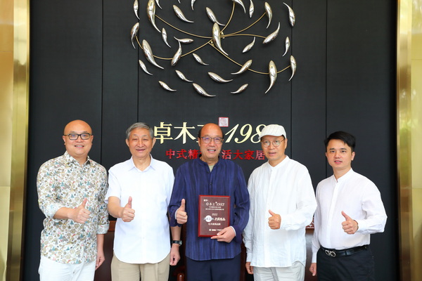 全联艺术红木家具专业委员会专家顾问、故宫博物院文保科技部原主任曹静楼(左二),全联艺术红木家具专业委员会专家顾问、清华大学家具设计高研班讲座教授彭亮(右二),全联艺术红木家具专业委员会执行会长、品牌红木总编林伟华(右一)走进卓木王,中国传统工艺大师、卓木王董事长杜承三(左三)与卓木王总裁杜长江(左一)接受《大国精品》栏目颁牌