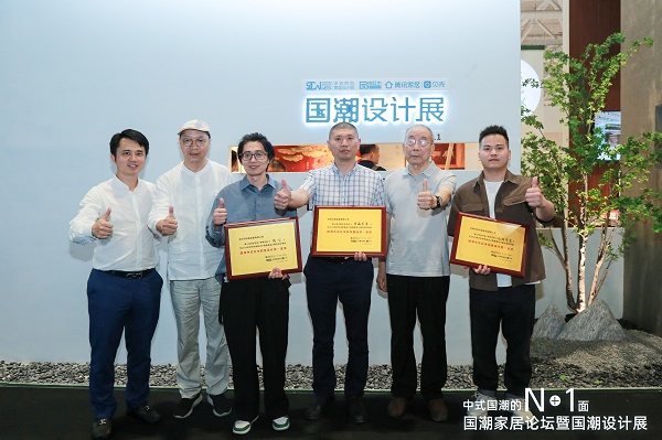 全联艺术红木家具专业委员会专家顾问、中国红木家具技术专家曹新民(右二),全联艺术红木家具专业委员会专家、清华大学家具设计高研班讲座教授彭亮(左二),全联艺术红木家具专业委员会执行会长、品牌红木CEO林伟华(左一)与深圳时尚家居设计周国潮设计展获奖企业代表东阳古森红木董事长吴飞阳(右三),深圳拾贰空间·茶事品牌创始人金如箭(左三),东阳名木居·茶悦品牌创始人刘冰冰(右一)合影留念