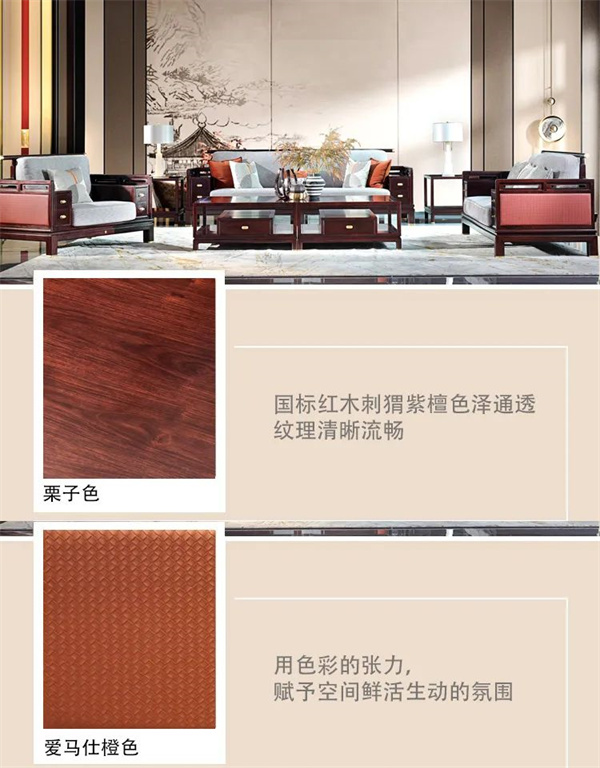 以温柔的栗子色为基调,搭配明亮质感的爱马仕橙色,减少了沙发的厚重感,增添了鲜活轻盈之力,拥抱现代简约舒适的家居氛围。
