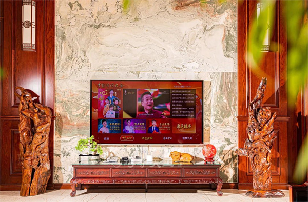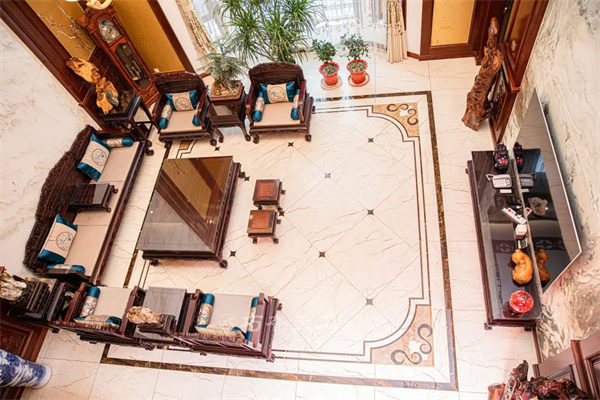 客厅沙发主背景以大理石为主,两侧加以实木线条点缀,清式双狮迎福沙发与自然纹理的大理石碰撞一起,奢与简的搭配,刚柔并济,彰显贵气。