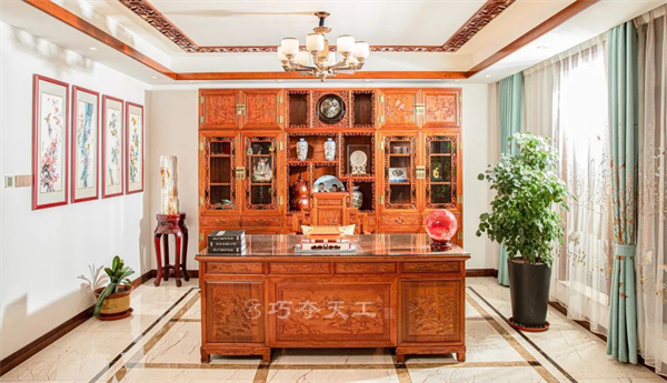 红木书柜与文房四宝、摆件等一应俱全,适当的布置一些盆景,书房的中式文化氛围立马就体现出来了。