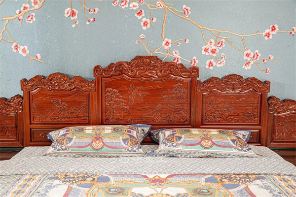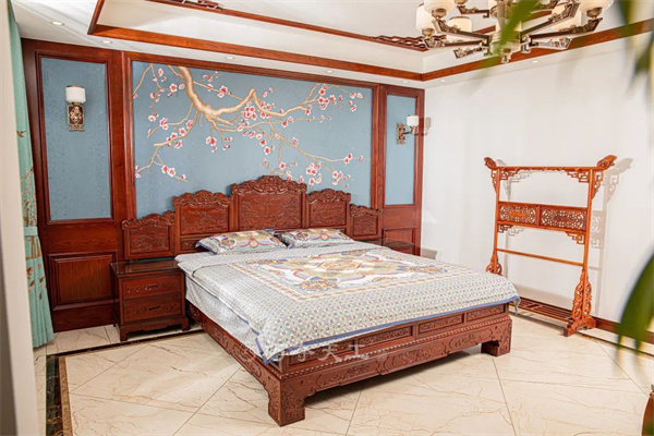 卧室背景墙的图案,搭配红木大床,使得整个空间呈现出典雅又不乏时尚的特色,让我们放下身心享受生活的慢节奏......