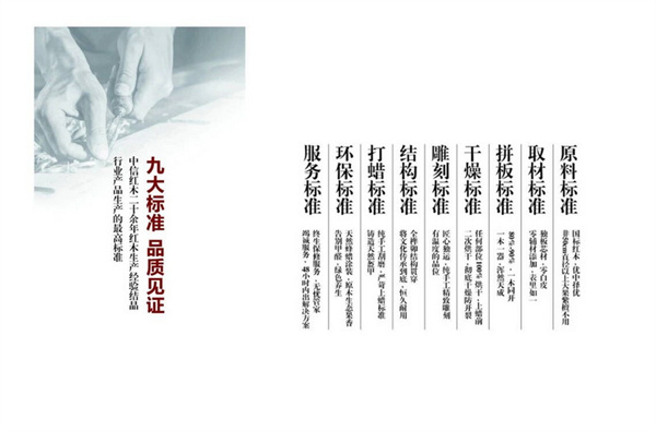 通过技术创新加快产品迭代升级,开发出绿色健康型新产品,中信红木为消费者们提供了强有力的绿色保障。在高速发展的过程中,中信红木更是不断深化标准,在研发、生产阶段建立了完善的品质保障流程,以国家标准和行业标准为基础,以远高于行业的生产标准来严控产品品质,中信红木从原料、取材、拼板、干燥、雕刻、结构、打蜡、环保、服务9大维度制定了远高于行业标准的“九大标准”。