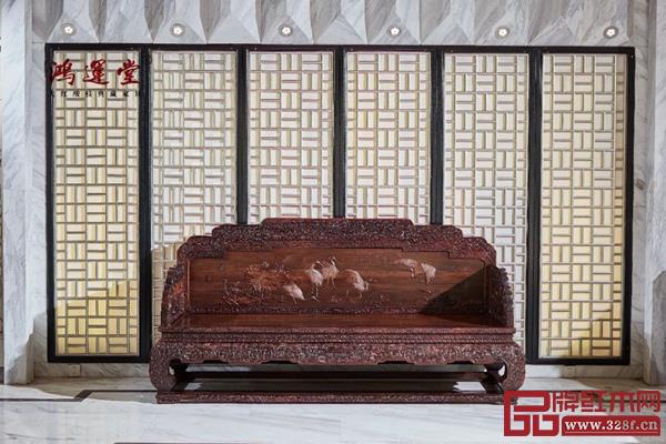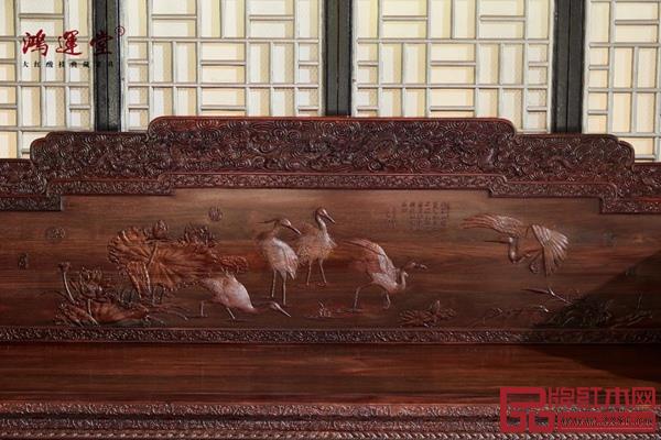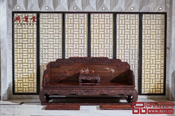 沙发靠背板上雕刻白鹭荷花图,将这两种意象组合到一起,又蕴含家庭和美、路路和顺的美好祝福。