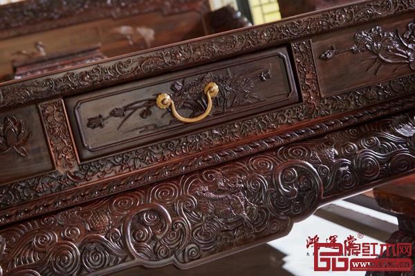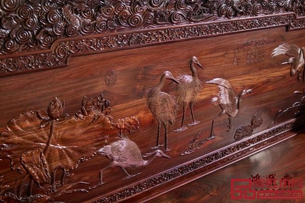 “荷”音同“和”,将荷花雕刻在红木沙发上,不仅赋予了沙发和美和顺、超凡脱俗的美好寓意,同时也增添了沙发的装饰美感:花叶挺拔、清秀飘香。