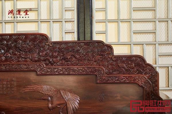此款沙发巧用檀雕技法,浮雕荷花、白鹭、祥云、龙纹、花鸟、麒麟等图案,神态逼真、线条细腻,尽显匠师技艺之精湛。