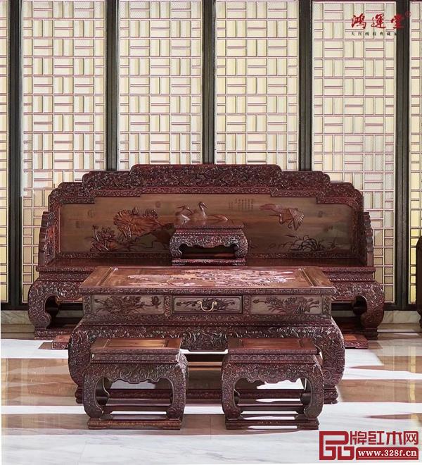 鸿运堂《荷花宝座沙发》造型恢弘有气势、器型方正端庄,尊崇传统榫卯结构,手工雕刻栩栩如生,是不可多得的收藏、实用之佳品。