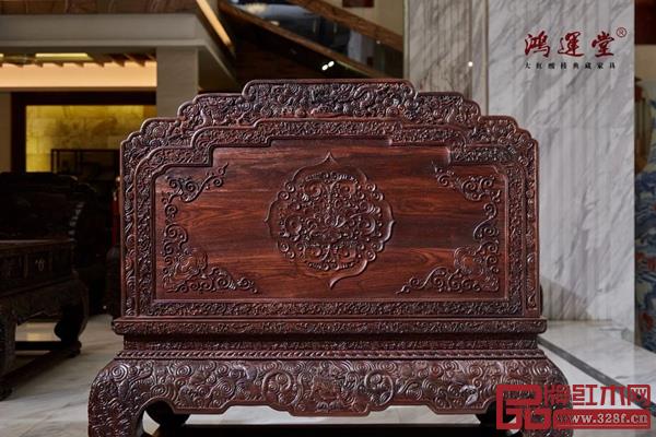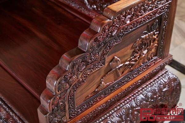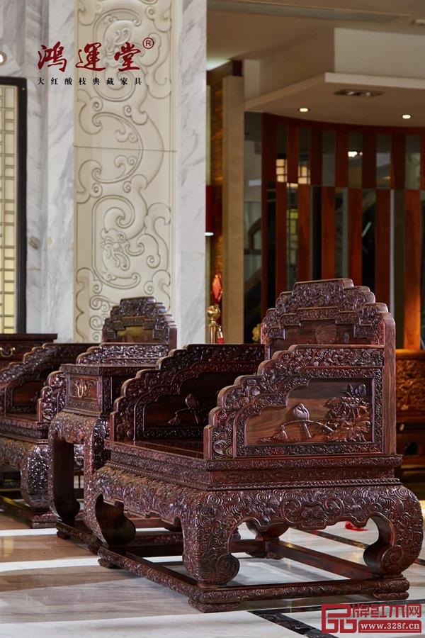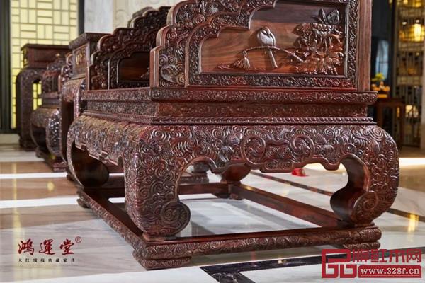尤为难能可贵的是,如此精细复杂的雕刻都是鸿运堂匠人们纯手工雕琢出来的。整套沙发都是双面雕花,刀工圆润舒放,回旋起落雄奇,气韵贯通、浑然一体、栩栩如生。