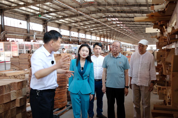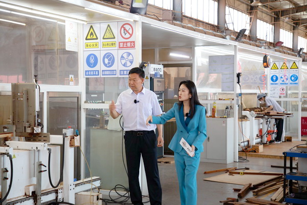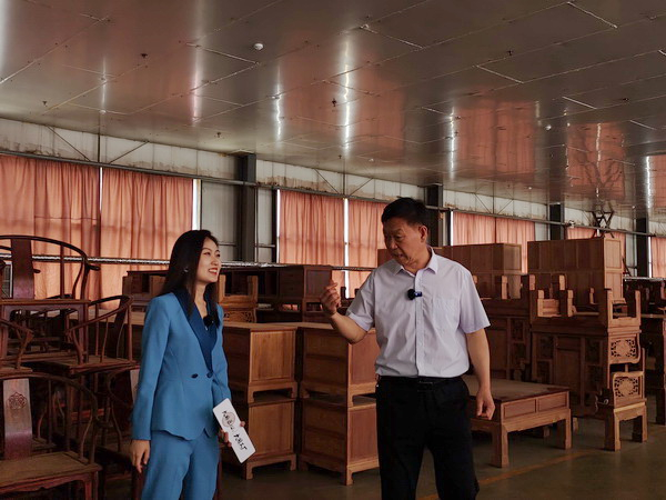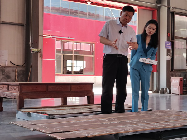 巧夺天工红木董事长张爱冬(左)与主持人探访巧夺天工红木工厂流水线