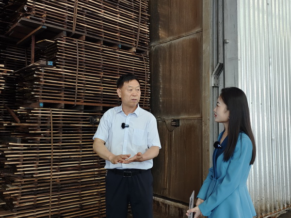 巧夺天工红木董事长张爱冬(右)与主持人探访巧夺天工红木工厂二次烘干房