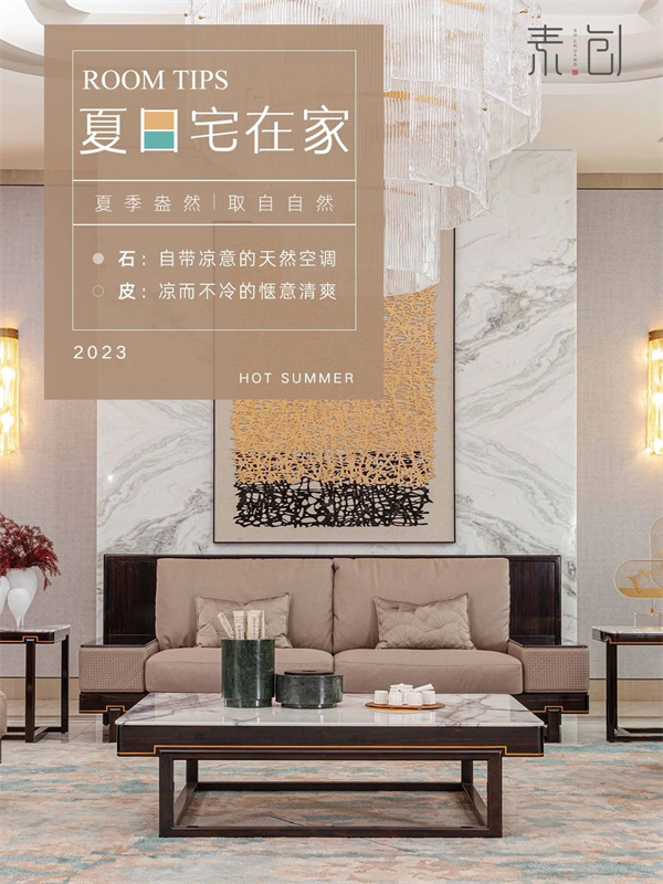 大理石的自然纯粹,牛皮的温凉细腻,经由素创家居设计师的巧思秒想,与条纹乌木的和谐搭配,让你宅在家中,也能享受到夏日的清凉与自在。