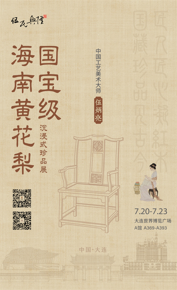 中国(大连)国际文化旅游产业交易博览会将于2023年7月20日至23日开展,中国工艺美术大师、传统家具设计大师、伍氏兴隆明式家具艺术有限公司董事长兼艺术总监伍炳亮先生应邀携带国宝级海南黄花梨等稀世珍品隆重参展。